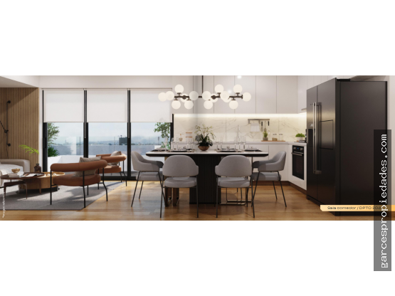 Cocina. piso: cerradas: porcelanato. abiertas: SPC. muebles altos y bajos con poliuretano, interior de melamine. tablero piedra natural o cuarzo. salpicadero en porcelanato. lavadero para empotrar de 1 poza en acero. grifería mono comando.